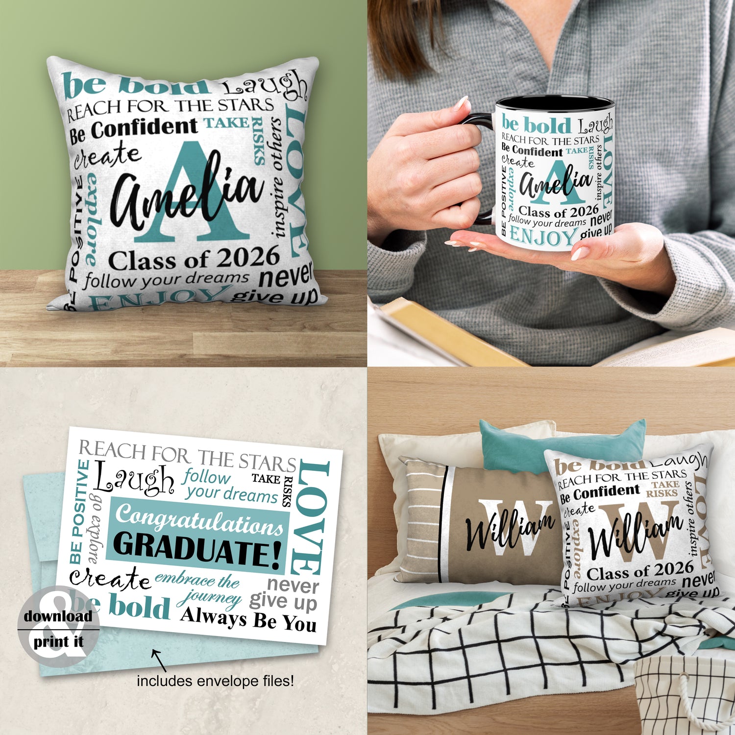Personalized Pillows, Graduation Mugs, and Printable Grad Cards are all on sale.