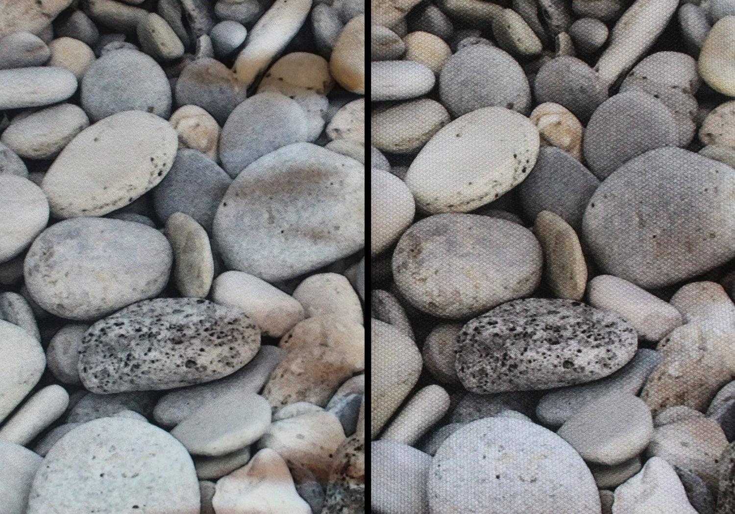Here's a fun comparison of the two fabrics printed with the same design. On the left is the Velveteen, and on the right is the Polycanvas.