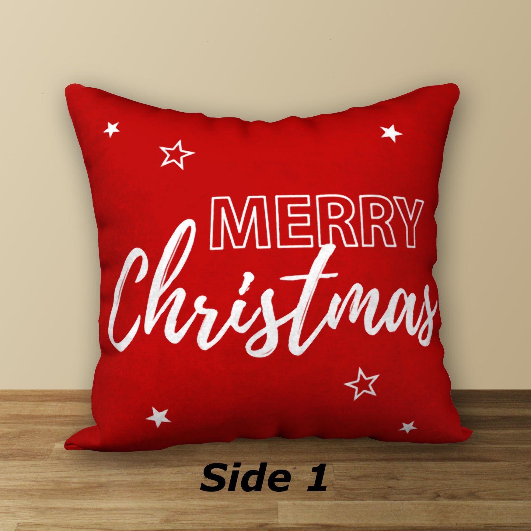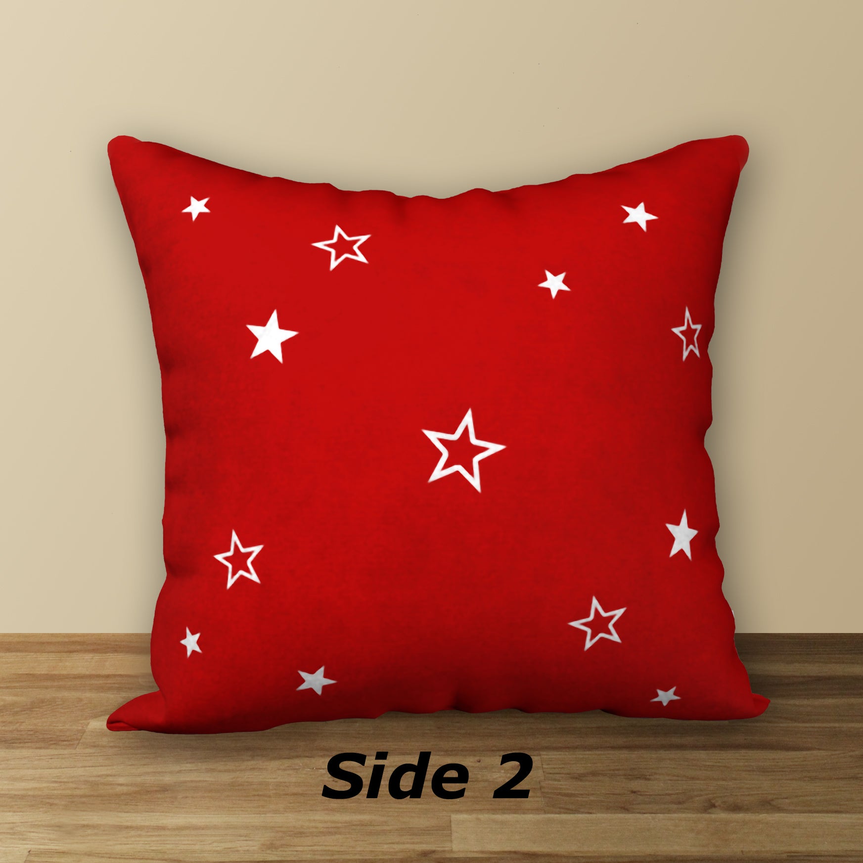 Side 1 of this cushion proclaims 'Merry Christmas' on a red background with white stars, and Side 2 features the same stars scattered randomly. Both sides of this pillow cover are printed on supersoft polyester velveteen...soft and cozy (and washable). I’m very proud to offer this superior product.