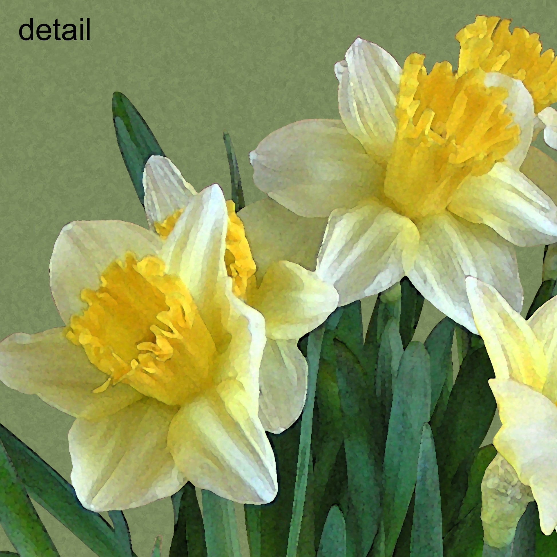 Design Story: My husband surprised me with a lovely pot of daffodils early last Spring. Such a lovely thing to receive on a snowy day in March! When they began fully blooming, I took several photos and got right to work in my studio. This artwork is the result. 😊
