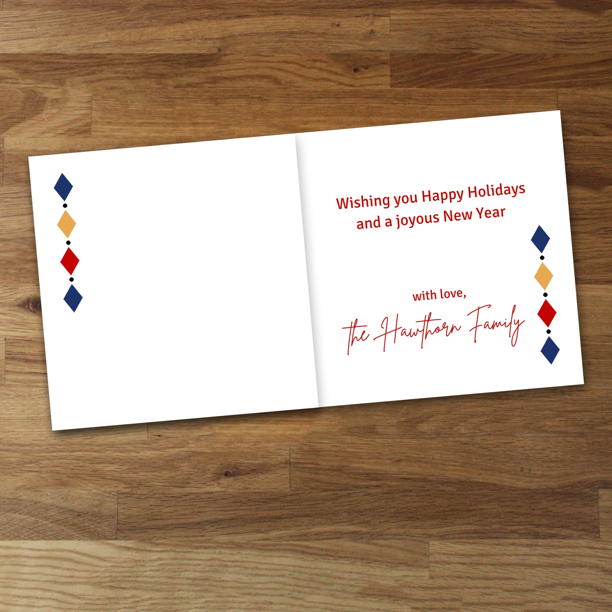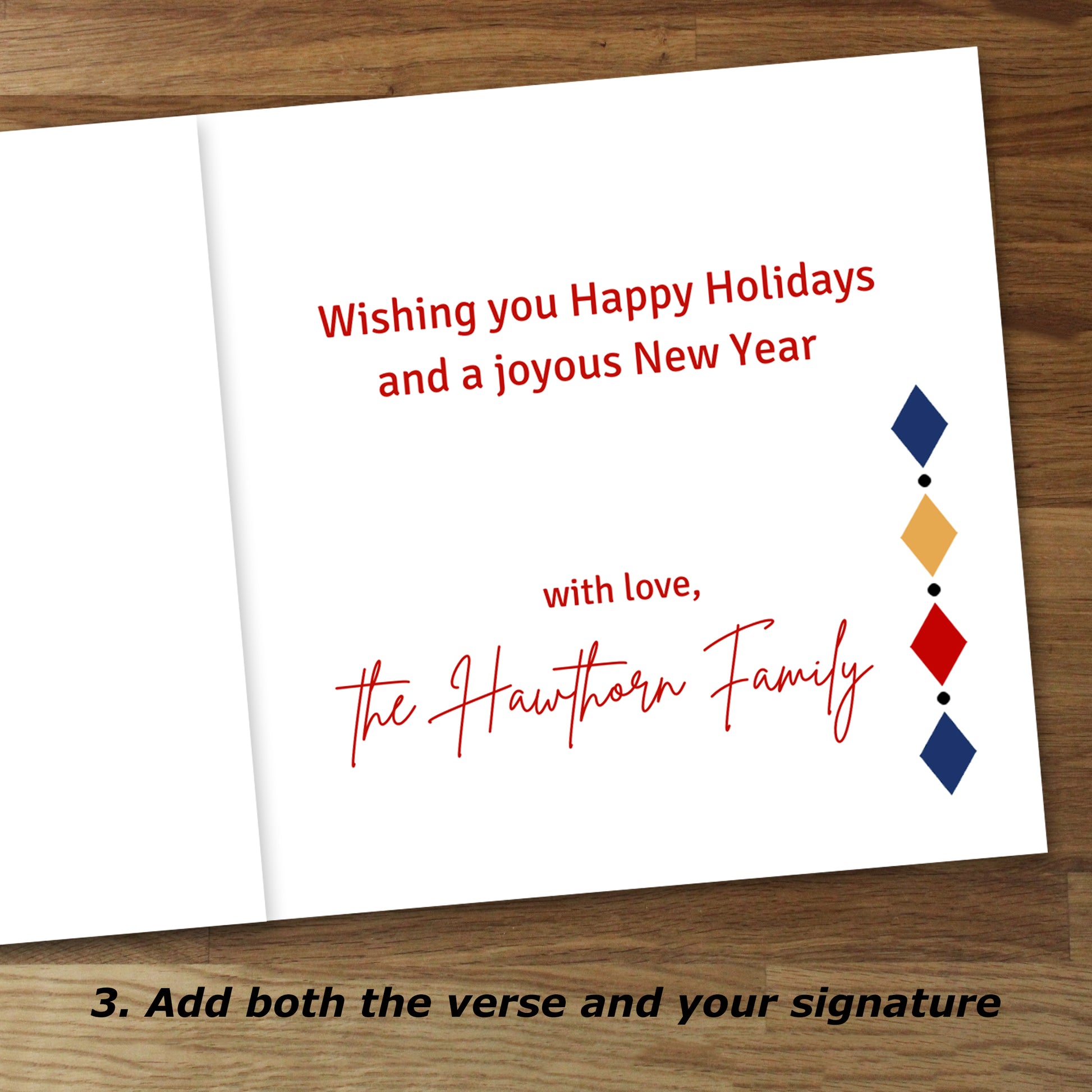 Choose to leave the card inside with no type (and add your own message), include the Holidays verse (see photos), or add the verse plus your choice of 'signature' (this choice is great if you send a lot of cards, or want cards to send from your business).
